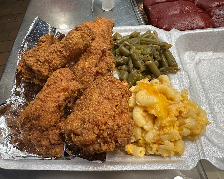 Signature Dish: Fried chicken platter or baked chicken with two sides